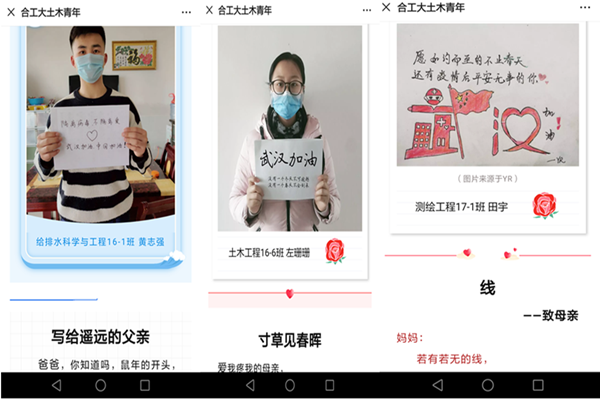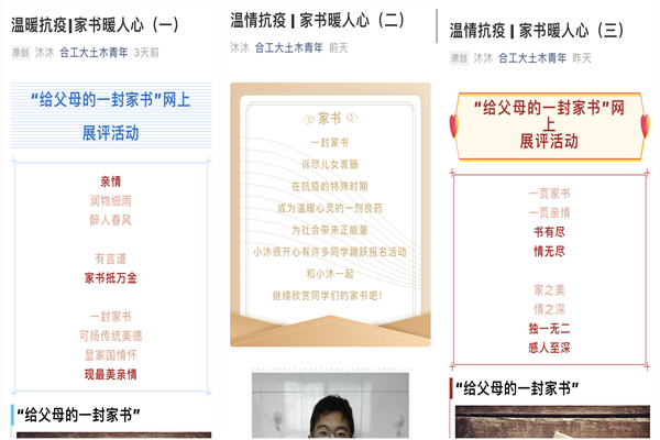 一封封家书,是传统文化的回归,也是漫时代亲情的印记。见字如晤,纸短情长。此次活动从发起至今,各年级同学热情高、兴趣浓,不到一周的时间已收到家书90余篇。一封封家书,没有华丽的辞藻,朴实无华的文字却打动人心。疫情期间,公司每天会遴选部分优秀作品在“合工大土木青年”微信公众号上进行展评。