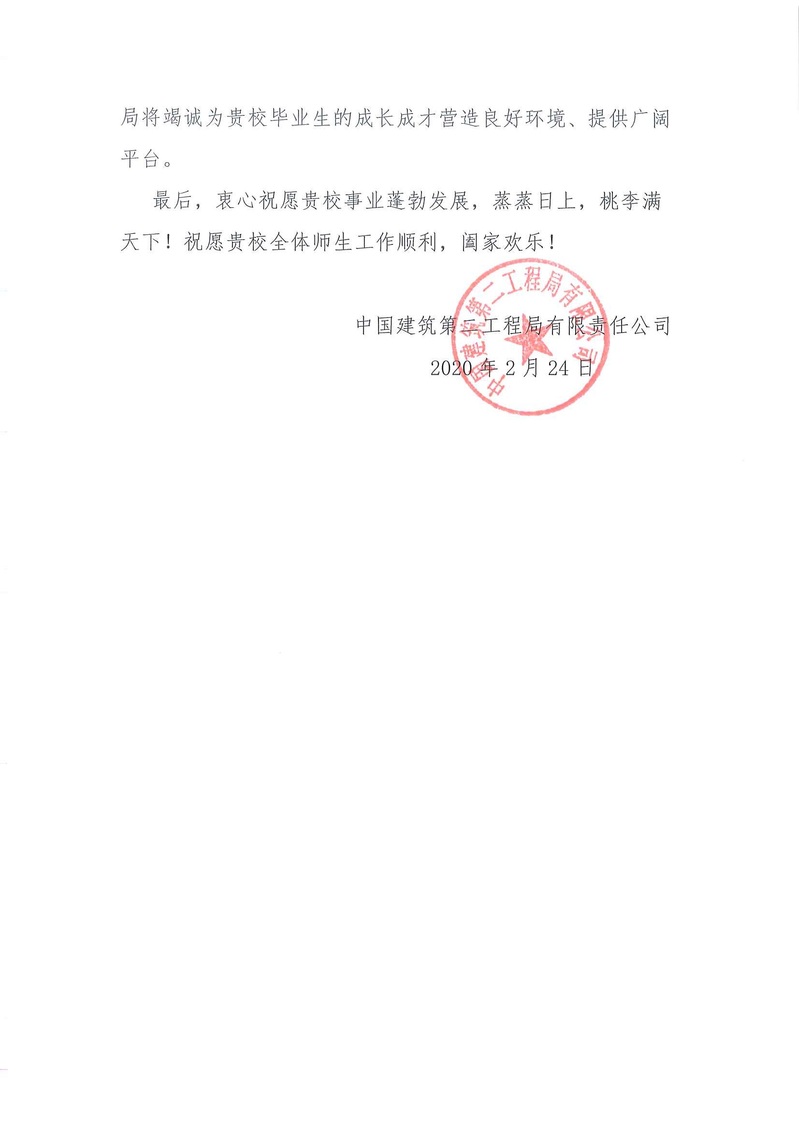 近年来,贵校为我局输送了大批优秀人才,他们奋战在二局的各个岗位,以初心和使命践行着“厚德、笃学,崇实、尚新”的校训,他们有的走上了领导岗位,有的成长为公司业务骨干,为推动中建二局的发展做出了重要贡献,中建二局将竭诚为贵校毕业生的成长成才营造良好环境、提供广阔平台。