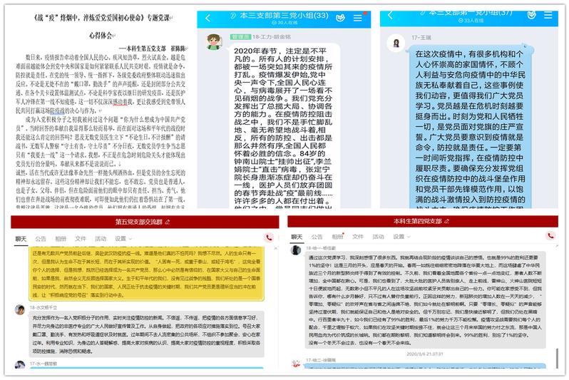 党课结束后,同学们纷纷发表学习体会,本科生第五党支部书记陈灵蔚说到:“本次党课更加坚定了我对祖国打赢疫情阻击战的信心,中国人民在疫情防控中展现的中国力量、中国精神、中国效率,既展现了负责任大国形象,又生动谱写了可歌可泣的英雄篇章,诠释了凝聚中华民族磅礴伟力的伟大精神。对比国外面对疫情挑战的一些应对措施和情况,我们能更加能证明我们的党集中力量办大事的能力,更能感受到中国政治制度的优势!”“此次疫情所带来的启示和影响,对于我们普通员工党员来说将是一个长远考验和终身课题,本次党课更加启发了我作为一名新时代老员工党员,今后要持续学习思考、坚定信念、勇于担当,为夺取战疫全面胜利和中华民族伟大复兴“中国梦”不懈奋斗!”本科生第一党支部党员张玉冰说。