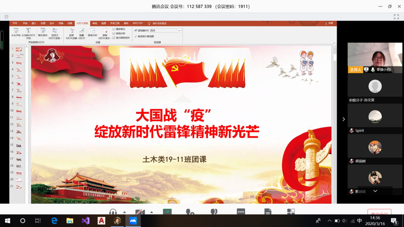 共抗疫情,雷锋精神代代相传。在微团课的最后,各支部青年团员围绕新时代老员工应该如何传承和弘扬雷锋精神进行了积极的讨论。广大团员青年对国家和人民终将战胜此次疫情充满信心,纷纷表示要向身边的活雷锋学习,在新时代用实际行动践行雷锋精神。遵守公司规定,不提前返校,安心居家线上学习,为疫情防控贡献自己的一份绵薄之力。土木类19-1班团支部书记付晓莉说到:“自新冠肺炎疫情发生以来,举国上下齐力同心、各方协同与共、风雨同舟,合力迎难而上,打好疫情防控的全民战、阻击战。无数新时代活雷锋逆行奔赴一线、操守端严、传递温情。作为青年团员,我们要向新时代活雷锋学习,听从号召,积极践行志愿服务精神,热情奉献青春力量,做一个有责任心的中国人,做一个有担当的老员工!”