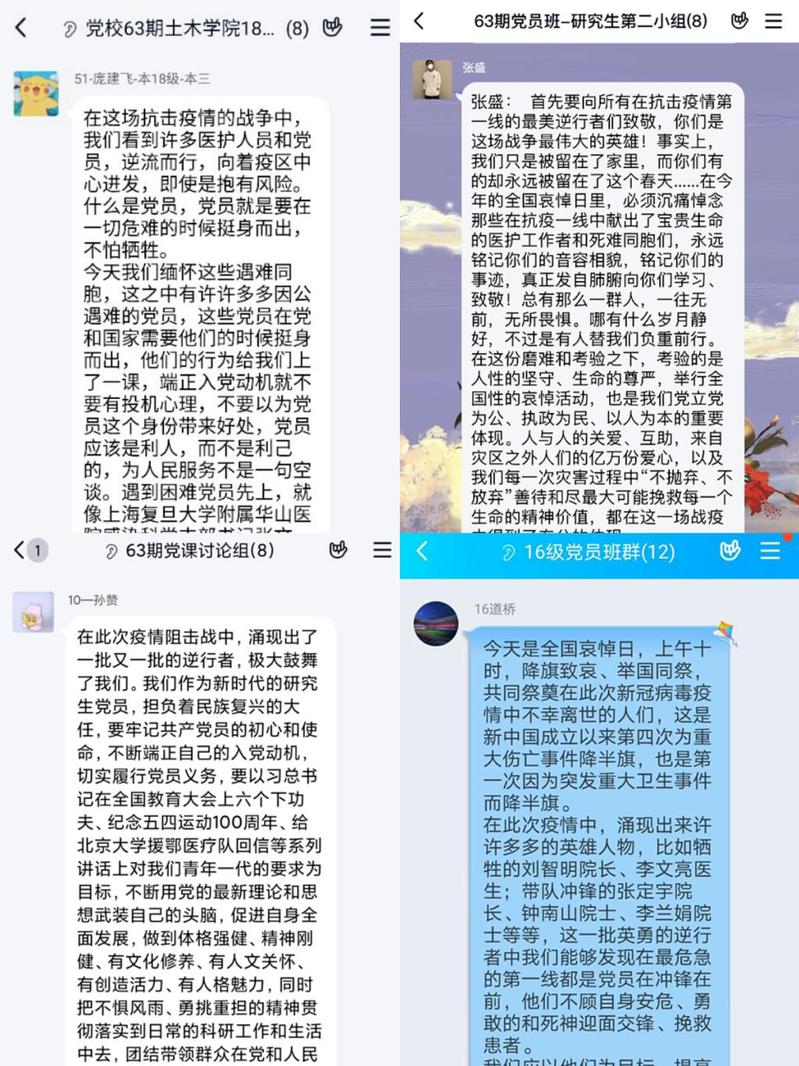 不忘入党初心,扎实党员教育。清明是追思过往的回眸,也是希冀未来的遥望。从寄托哀思到走向新生,我们不只有肝肠寸断的忧伤,更有坚韧不拔的意志。武汉的樱花开了,城市陆续“解封”,全国各地工厂响起了机器的轰鸣声,大街小巷再次氤氲着令人怀念的“烟火气”,这是以一大批党员同志为先锋的祖国同胞用莫大的牺牲换来的,取得疫情防控的最终胜利,我们必须全力以赴。建筑环境与能源应用工程2018-1班庞建飞表示从集中讨论中受益匪浅,他说,在这场抗击疫情的战争中,一群“最美逆行人”向着疫区中心进发,而其中大部分都是共产党员。党员就是随时准备为党和人民牺牲一切,‘遇到困难我先上’是一种责任,一种追求,就像张文宏医生所说的契约精神,这种遇到困难主动向前的无畏精神,更加坚定了我加入中国共产党的决心。
