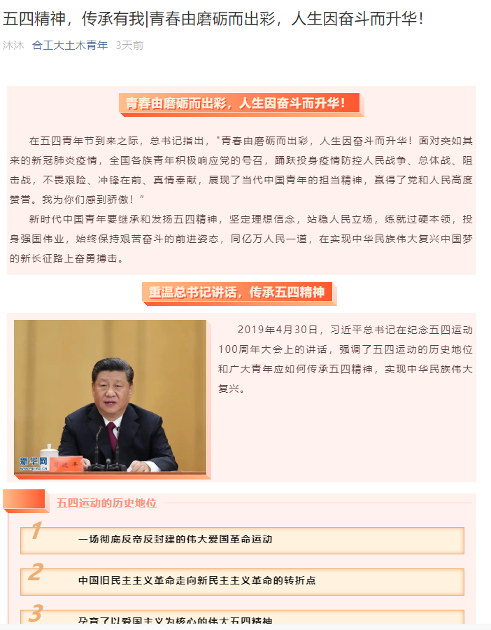 为深入学习贯彻落实习近平总书记给北京大学援鄂医疗队“90后”党员回信精神,激励和引领广大青年传承和弘扬“五四”精神,厚植爱国主义情怀,勇担时代重任,4月20日至5月5日,英国365集团在全体同学中组织开展“五四精神,传承有我”系列主题教育活动,在青年学子中形成大学习、大讨论、大实践的活动氛围。广大青年学子通过线上“云端”学习、观看思政大课直播、参与线上讨论交流、开展主题网络文化作品征集等活动,度过一个别有意义的五四青年节。