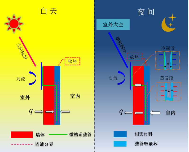 公司何伟教授团队提出了一种新型相变墙体(RC-PCM),其综合了相变材料高蓄热能力、微槽道热管(Micro-channel heat pipe, MHP)高热导率、天空辐射制冷(Radiative cooling, RC)自发散热的优势,即利用连接相变墙体与辐射制冷装置的微槽道热管,在夜间快速地将存储在相变墙体的热量通过辐射制冷及空气对流的方式释放到室外,使得相变墙体能够实现完整的融化-凝固-融化的相变过程。