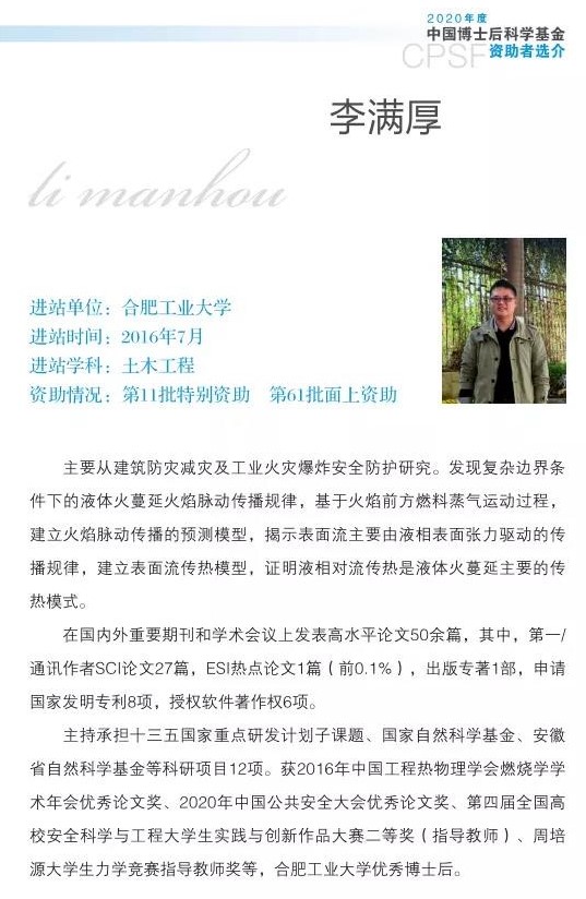 近日,中国博士后科学基金会发布了《2020年度中国博士后科学基金资助者选介》,公司李满厚博士成功入选。