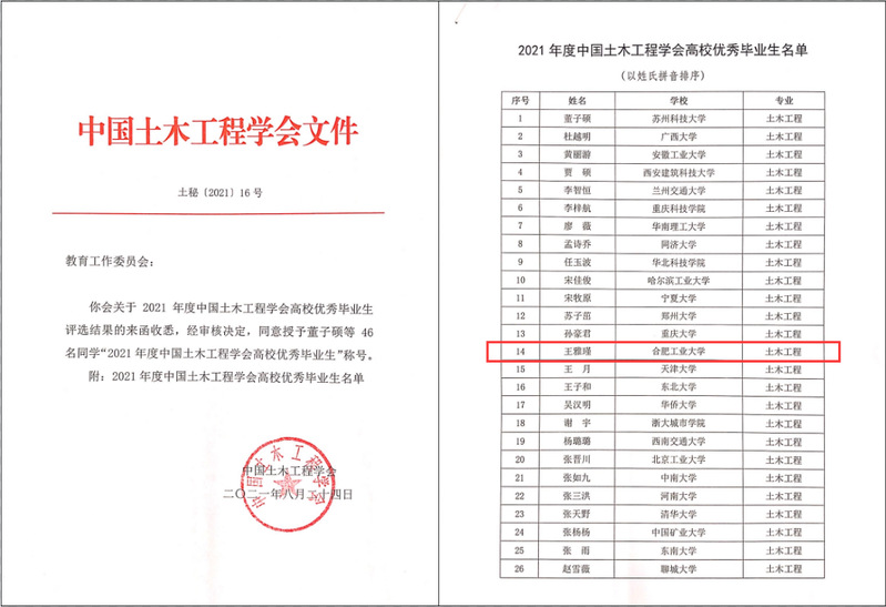 824日,由中国土木工程学会举办的2021年度中国土木工程学会高校优秀毕业生评选活动落下帷幕,公司2017级土木工程专业王雅瑾同学荣获“2021年度中国土木工程学会高校优秀毕业生”(全国共46名)。