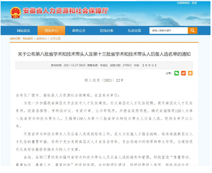 近日,安徽省人社厅发布《关于公布第八批省学术和技术带头人及第十三批省学术和技术带头人后备人选名单的通知》(皖人社秘〔2021〕139号)。公司何伟教授、王昌建教授成功入选第八批安徽省学术和技术带头人。此次评审经基层推荐、各行业主管部门初评、专家评审,并经厅长办公会研究同意,第八批省学术和技术带头人人选120名,第十三批省学术和技术带头人后备人选120名。
