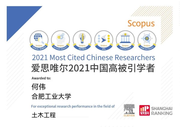414日,爱思唯尔(Elsevier)正式发布2021“中国高被引学者”(Highly Cited Chinese Researchers)榜单,公司土木工程学科何伟教授荣登榜单。