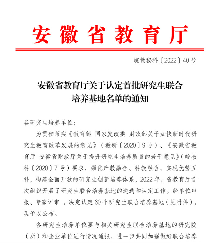 近日,安徽省教育厅组织开展了省级研究生联合培养基地的遴选和认定工作,经单位申报、专家评审,最终遴选出60个首批省级研究生联合培养基地(皖教秘科〔2022〕40号)。公司联合安徽省路港工程有限责任公司、安徽富煌钢构股份有限公司申报了省级研究生联合培养基地,均成功入选。