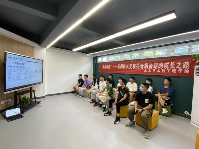 交流会由员工第三党支部原支部书记、首届董事长奖获得者、2018级工程力学专业胡金铭主讲。胡金铭首先针对工程力学专业进行了专业分析,旨在帮助正在面临专业分流的2021级员工进行专业认知引导。此外,胡金铭围绕大学目标制定、品质磨炼、能力提升、生涯规划等方面进行了分享交流,他希望学弟学妹们心中有梦有远方、脚下有路有力量,在宝贵的大学时光里以奋斗为底色,不懈追求德才兼备、能力卓越,用实际行动践行“强国有我”的铮铮誓言。