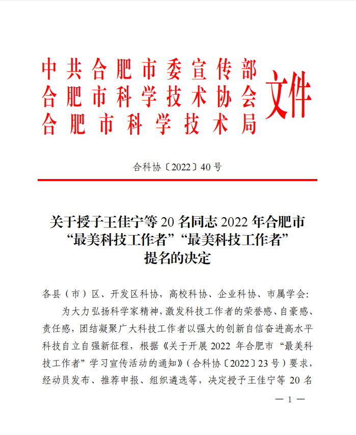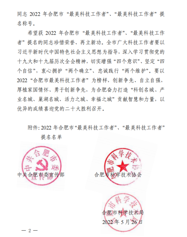 近日,中共合肥市委宣传部、合肥市科学技术协会、合肥市科学技术局公布2022年合肥市“最美科技工作者”、“最美科技工作者”提名的决定,公司能源动力专业博士生沈念俊荣获2022年“合肥市最美科技工作者”。