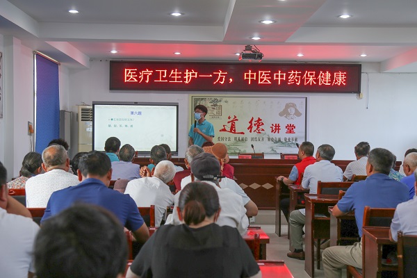 宣讲中医岐黄知识,发扬传承国医精髓。中医药学是中华民族的伟大创造,也是中国古代文明的瑰宝。在淮安市第一人民医院,团队开展了对中医中药的实地调研。在陈守龙医生的带领下,团队成员认真观摩人体穴位模型,仔细观察了推拿、针灸等项目。同时,团队成员还对在场的病人们发放调查问卷,并就对中医药的认识进行了采访。在山阳草堂国医馆,团队了解到了各种不同中药的名称及其用处,同时也学习了如何称量、研磨、熬制药材。在中医药防治宣讲活动过程中,制药工程专业汤康丽同学向村民们科普了中医药的防治原则、治疗方法和常见中药,进行了一系列中医药知识趣味问答活动、经验分享活动等,最后由团队副队长周婷带领大家学习健身操,引领村民们养成科学健康的生活方式。