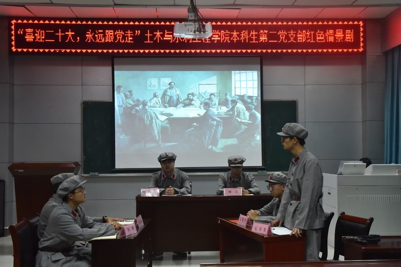 “砼”心演绎,青春向党。10月3日,公司本科生第二党支部在纬地楼515室以“喜迎二十大,永远跟党走”为主题开展了“遵义会议”红色情景剧展演活动。演出最后,全体师生挥舞国旗,齐声合唱《我和我的祖国》,向祖国母亲致以崇高的敬意和真挚的祝福。