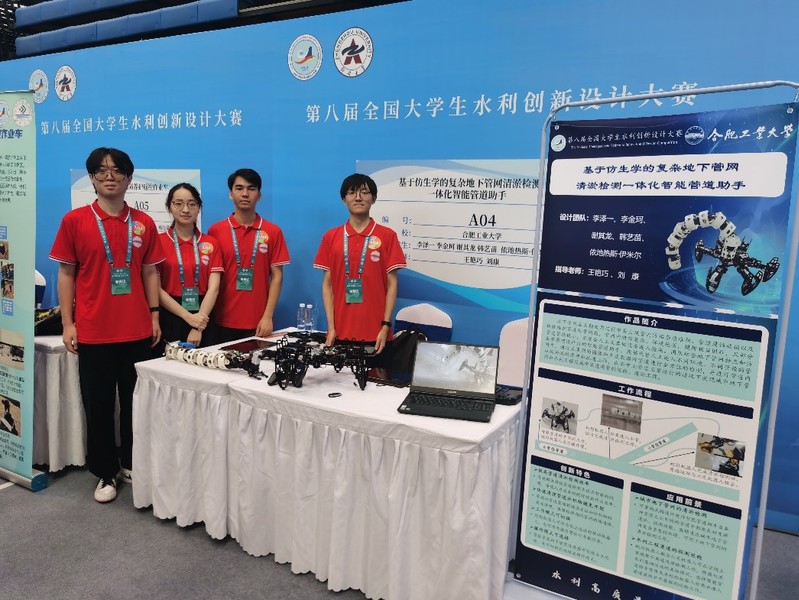 决赛经过现场作品演示以及参赛队员答辩,公司学子展现出了良好的精神面貌和专业素养,获得了评委专家和兄弟院校参赛师生的一致好评。王艳巧、刘康指导,李泽一、李金珂、谢其龙、韩艺苗、依地热斯·伊米尔同学设计的《基于仿生学的复杂地下管网清淤检测一体化智能管道助手》获特等奖;景月岭、张瑞钢指导,孙一品、高彦泽、李骥驰、曹恒、张津硕同学设计的《基于水空一体化调控凤眼莲的水体富营养化防治平台》获一等奖。