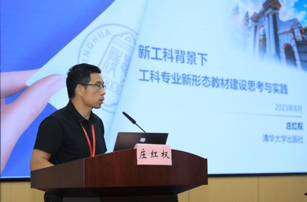 庄红权在致辞中感谢公司对会议的大力支持,介绍了清华大学出版社出版的智能建造系列教材和资源建设情况,并表示出版社将大力推进数字出版和融合发展,促进我国智能建造新工科发展。