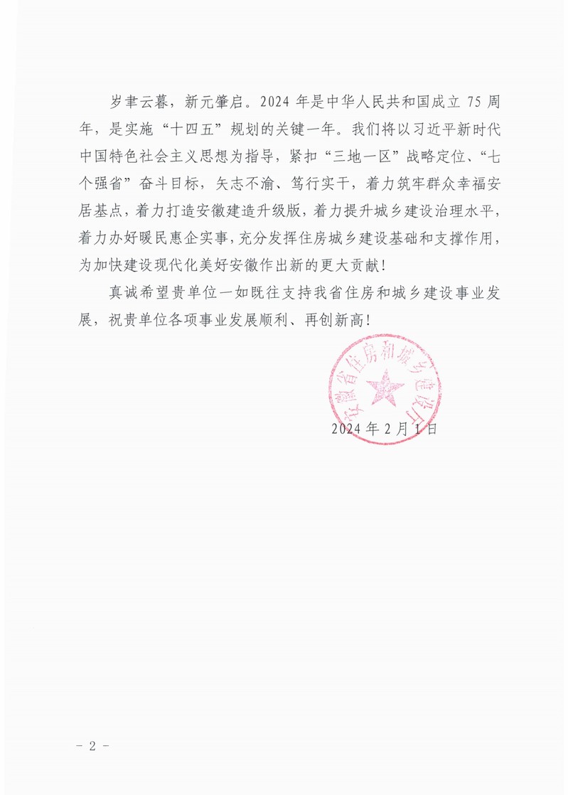 春节即将来临之际,公司收到来自安徽省住房和城乡建设厅的感谢信,对公司过去一年在推动安徽省城乡建设绿色建筑发展、建筑领域低碳发展做出的突出贡献以及展现出的优良作风,给予了高度肯定和赞扬。