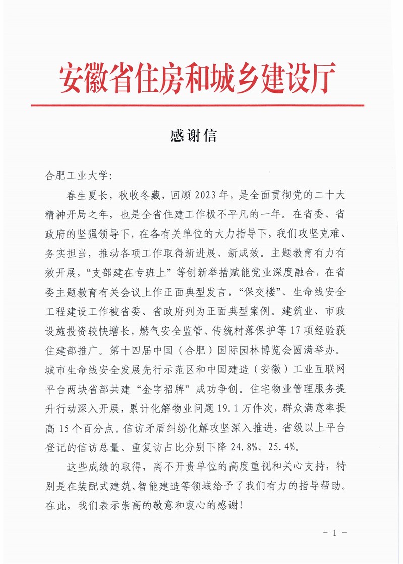喜讯,安徽省住房和城乡建设厅发来感谢信!