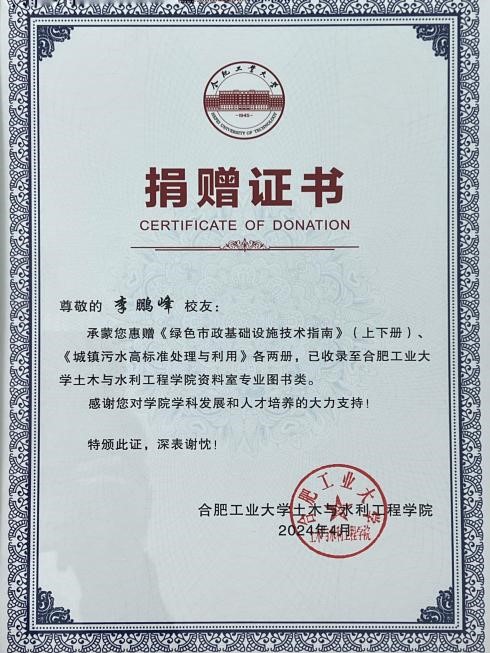 心系母校,情存土木,浓浓书香,传递真情。今年4月,2004届给排水工程专业员工李鹏峰向公司捐赠其参编的著作《绿色市政基础设施技术指南》(上下册)和《城镇污水高标准处理与利用》各两册,现已存入公司资料室专业图书类。
