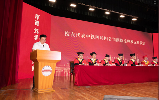 员工代表中铁四局四公司副总经理罗支贵向全体毕业生表示了最热烈的祝贺,向辛勤工作的老师们表达了最崇高的敬意,他勉励学弟学妹们能够风轻云淡地面对成功与失败,在今后的人生之路上不忘初心、树立信心,善于务小、敢于务大,致力于造福他人、造福社会,为母校争光、为祖国添彩。