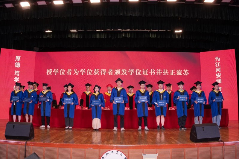 全体与会授学位者为学位获得者颁发了学位证书、扶正流苏并合影留念。