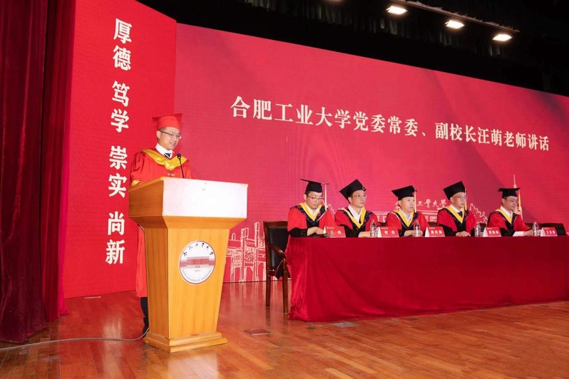 汪萌副董事长代表公司向圆满完成学业并顺利获得学位的毕业生们表示热烈的祝贺,向在座的老师、员工家长们表示衷心的感谢。他希望全体毕业生志存高远,脚踏实地,传承工大“工业报国”之志,明确青年担当,胸怀“国之大者”,把自己的小我融入祖国的大我、人民的大我之中,脚踏实地、砥砺前行,让青春在全面建设社会主义现代化强国的火热实践中绽放绚丽之花;热爱祖国,勇担时代重任,听党话,跟党走,心怀忧国忧民之心,爱国爱民之情,在实现中华民族伟大复兴的新征程上迎难而上,挺身而出,担负时代赋予青年的责任,发扬工大精神,争当时代先锋;守住底线,筑牢道德基石,提升道德认知,自觉道德养成,积极道德实践,做好每一件小事,完成每一件工作,做走在时代前列的奋进者、开拓者和奉献者;直面挫折,秉持奋斗精神,勇于面对生活挑战,直面挫折,不断磨砺自身意志品质,敢于斗争,矢志奋斗;心怀感恩,积极回报社会,用感恩的心面对家人、朋友、母校和生活中的点点滴滴,保持积极,汇聚昂扬向上的成长力量。汪萌表示,无论今后身处何方,母校都是同学们人生旅途的温暖驿站和坚强后盾。