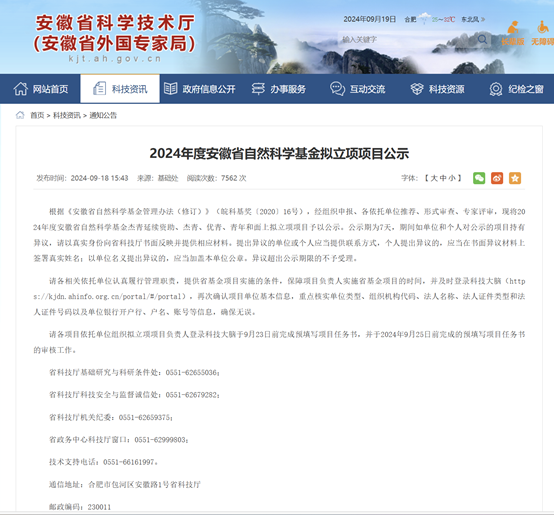 根据安徽省科学技术厅的2024年度安徽省自然科学基金杰青、优青、青年和面上拟立项项目公示,公司获批安徽省自然科学基金10项,其中杰青项目1项,面上项目7项,青年项目2项。