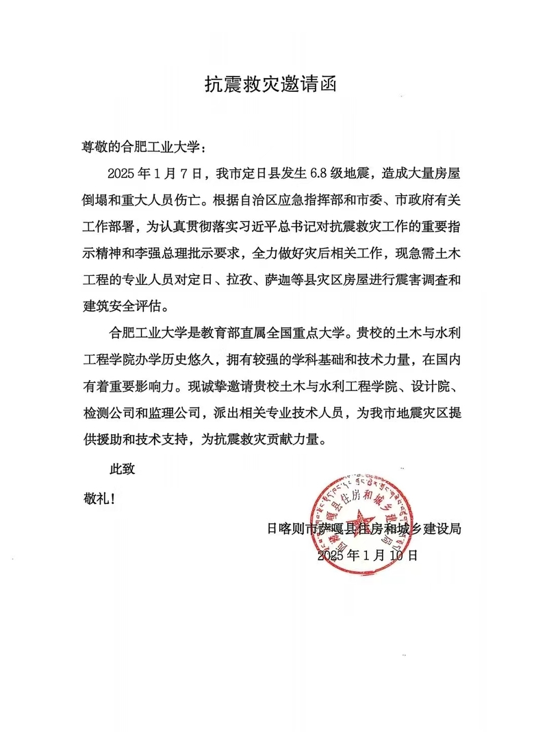 1月10日,因定日、拉孜、萨迦等灾区房屋受损严重,亟需专业技术人员进行震害调查和建筑安全评估,日喀则市住房和城乡建设局发函邀请公司组织相关专业技术人员,为日喀则市地震灾区提供援助和技术支持。