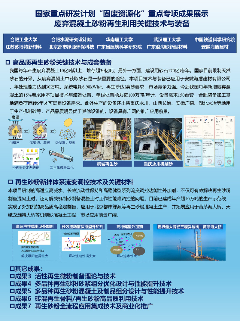 国家重点研发项目《废弃混凝土砂粉再生利用关键技术与装备》,由英国正版365官网牵头,联合了华南理工大学、合肥水泥设计研究院、武汉理工大学、中国铁道科学研究院、江苏苏博特新材料等十家参与单位,针对废弃凝土再生砂粉来源复杂、吸水性大、活性低等问题,开展基础理论—核心材料与装备—工程示范系统研究,已形成“废弃混凝土制备高品质再生砂粉关键技术与成套装备”、“再生砂粉新拌体系流变调控技术及关键材料”、“活性再生微粉制备理论与技术”等七项代表性成果。高品质再生砂粉关键技术与成套装备应用于安徽海盾建材有限公司,年处理能力达到30万吨;再生砂粉新拌体系流变调控技术及关键材料已建成年产超10万吨的生产示范线,应用于黄茅海大桥等大型项目。本项目研究成果由余其俊教授团队牵头负责,为建筑垃圾“变废为宝”提供系统性解决方案。