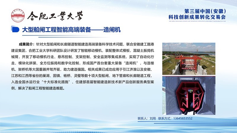 公司与安徽建工路港建设集团有限公司联合研发《大型船闸工程智能高端装备“造闸机”》,设计研发了智能移动模机,装配整体式模板,混凝土振捣机械臂,开发了移动模机行走、悬吊控制、支架控制、安全监测等集成系统,实现了自动化行走、模块化拼装、全方位振捣和数字化控制,形成国产首台套重大装备“造闸机”,与造楼机、架桥机等大国重器并驾齐驱,助力建造强国。相关成果已成功应用于引江济淮以及安徽、江苏和江西等省份的巢湖、固镇、杨桥、灵璧等数十项大型船闸、地下管廊和长廊隧道工程,入选全国水运行业“十大标准化措施”、住建部首届智能建造新技术新产品创新服务典型案例。本项目研究成果由王静峰教授团队负责,解决了船闸工程智能建造难题。