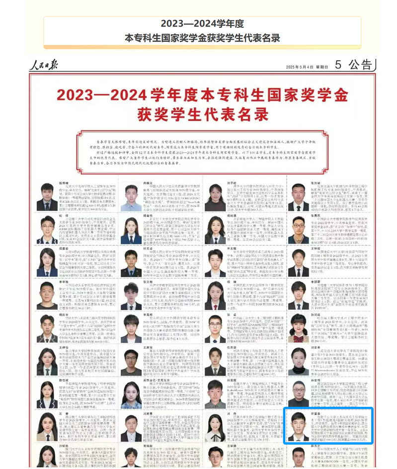 在纪念“五四运动”106周年之际,5月4日,《人民日报》刊登《2023—2024学年度本专科生国家奖学金获奖员工代表名录》,公司2021级本科生许晋嘉从全国12万名获奖者中脱颖而出,荣耀上榜(全国仅100人)。