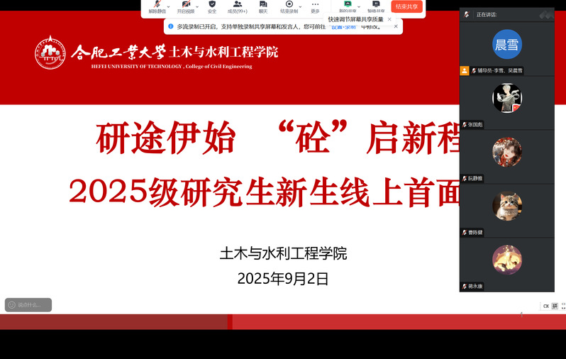 9月2日上午10时,英国365集团依托线上平台,开展“研途伊始,‘砼’启新程”研究生新生线上首面会。公司党委书记王东坡、研究生教学办公室主任陈涛、辅导员李雪、吴晨雪参加会议。2025级300余名硕博新生云端相聚,正式开启研究生阶段的全新旅程。